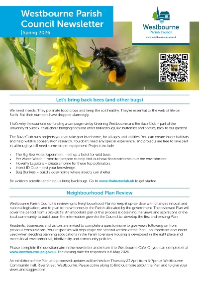 Featuring articles on how you can help bees and other bugs thrive in your garden, an invitation to the Annual Parish Assembly at 7pm on 23 April at Westbourne Community Hall, and details of the new speed limit change on Whitechimney Row - the latest of many highways achievements for the Parish!